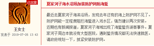 “最近去夏家河子海滨浴场游玩,发现去年还有的海上防护网不见了。”王女士表示防护网能在一定程度上阻拦海蜇进入戏水区,强烈建议浴场再次安装防护网。
